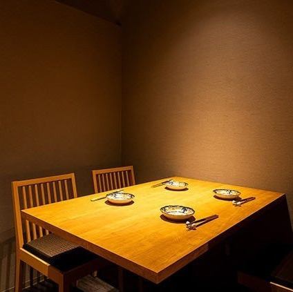 【テーブル席】カウンターからほど近いお席は小・中人数でのお食事に。ぬくもりを感じられる木目を基調としたテーブル席は、程よい照明の明るさと相まって、落ち着いた印象を受ける空間。2~4名様での少人数のお集まりはもちろん、隣のテーブルと合わせることで最大10名様でのお集まりにもご利用いただけます。