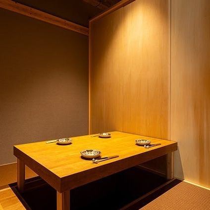 【掘りごたつ個室】プライベートなご宴会や外せないご接待に最適な寛ぎ空間。引き戸を開ければ広がる、和を基調とした寛ぎ空間。2~4名の少人数でのお集まりはもちろん、同じ仕様でご用意する合計3つの個室空間をつなげて、10名様以上のご利用も可能です。大切な取引先様とのご接待など、外せないお集まりに最適です。